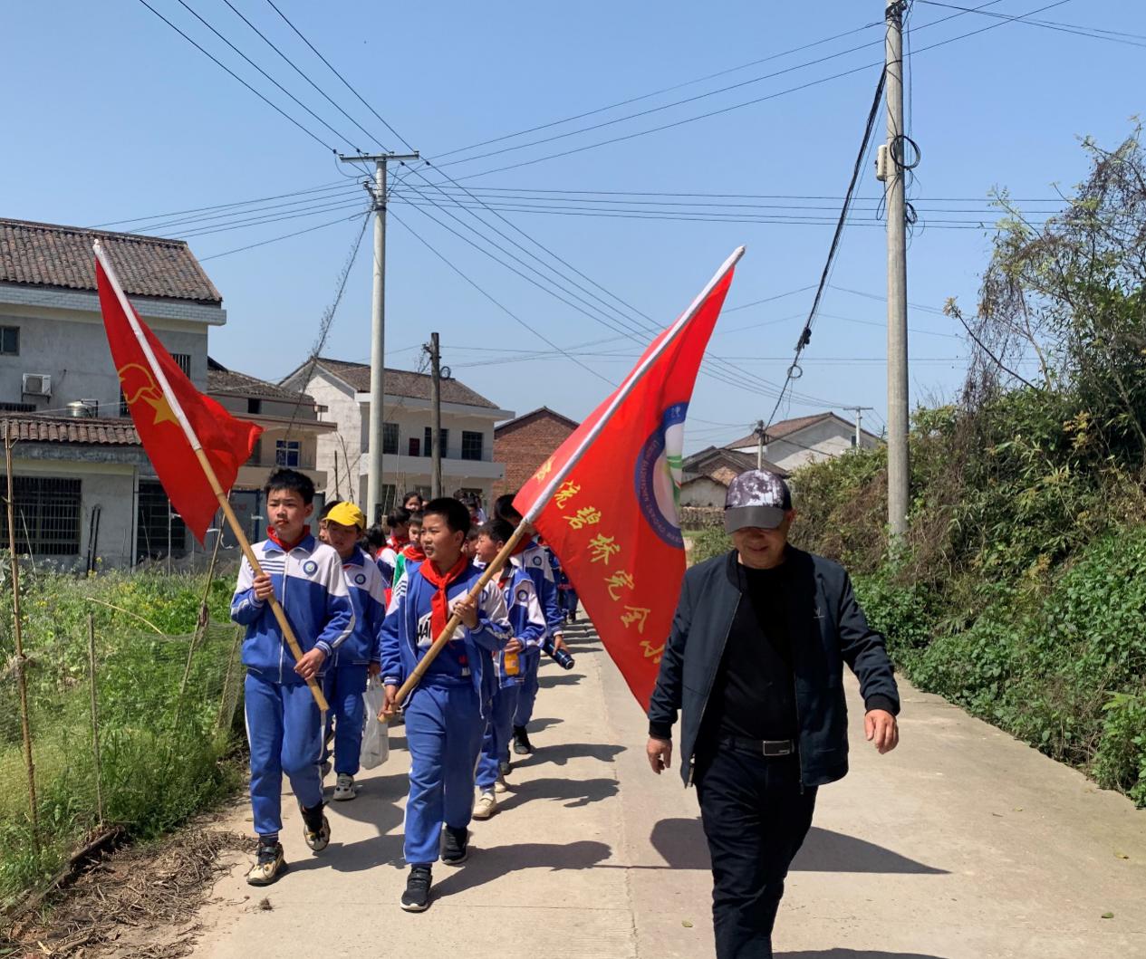 "我们是共产主义接班人,继承革命先辈的光荣传统......"伴着嘹亮的红歌,扬着鲜红的队旗,两路纵队在老师们的保驾护航下整齐有序行进,构成了春日里一道流动的风景。