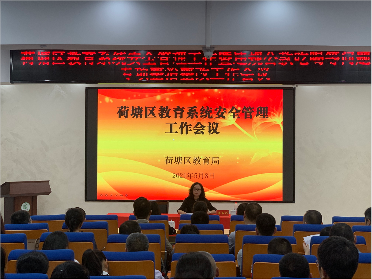5月8日,荷塘区教育局召开校园安全管理工作暨违规公款吃喝等问题专项整治整改工作会议。区教育局副局长潘书巧主持会议并讲话。