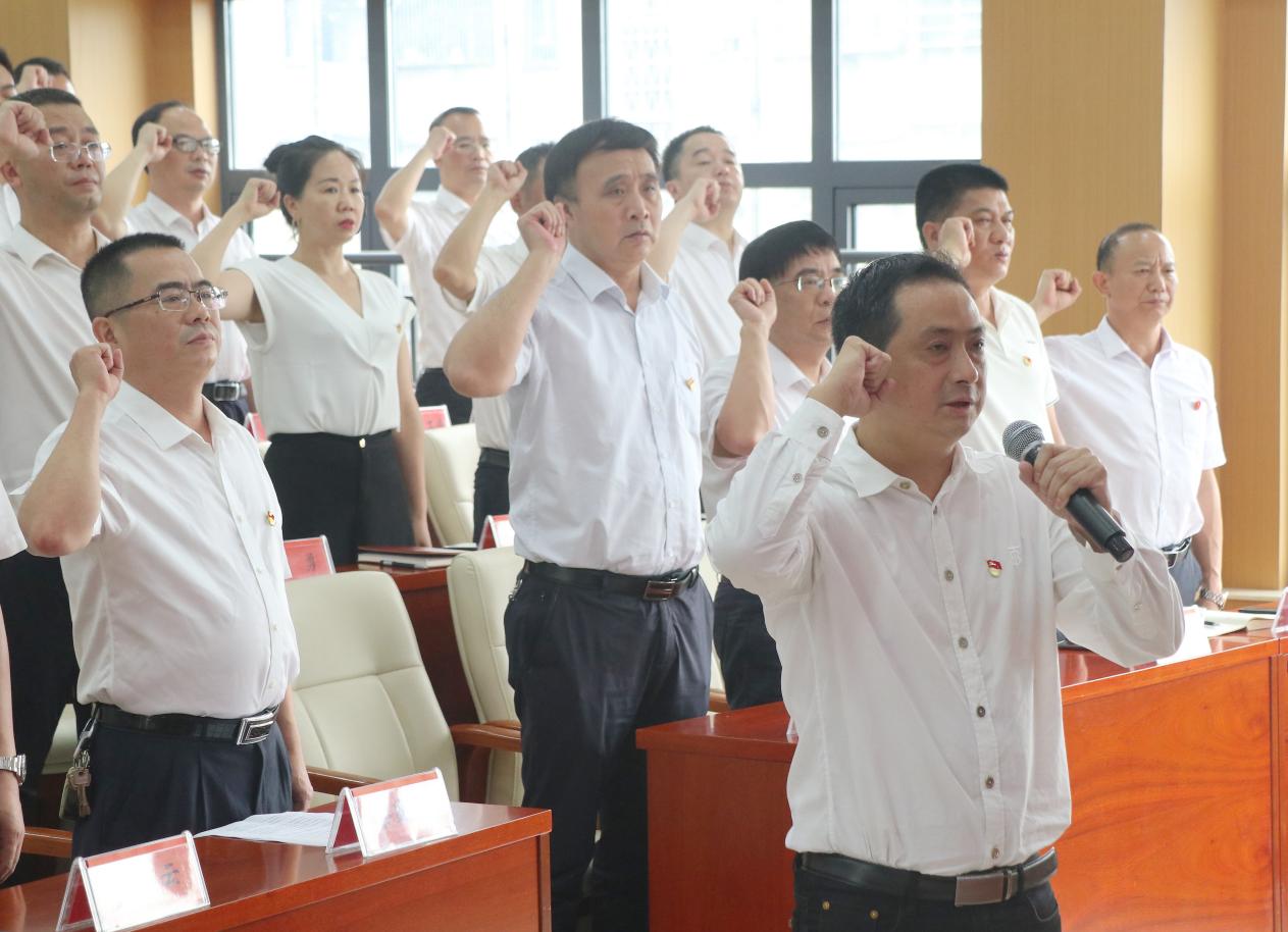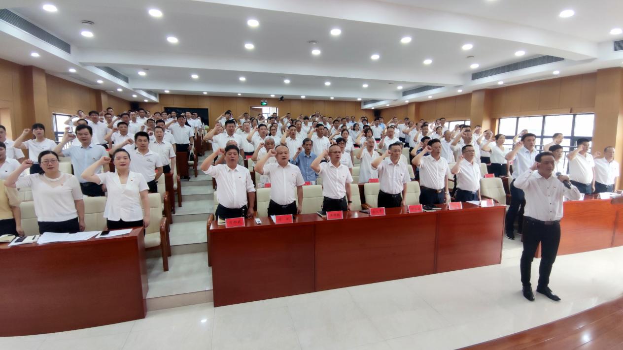 "我志愿加入中国共产党,拥护党的纲领,遵守党的章程……",教育局党委书记、局长余汉平带领全体参会人员高举右拳,重温入党誓词。