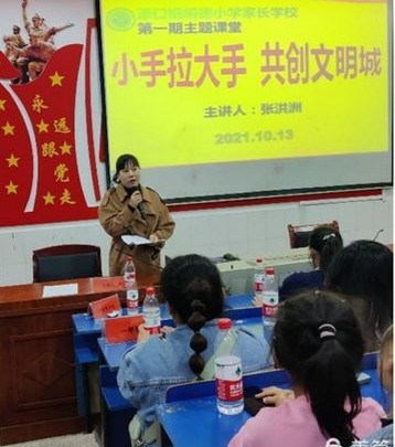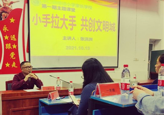 接下来是明德小学家长学校第一期开课,张洪洲校长作了以"小手拉大手,共创文明城"为主题的讲座。张校长用"点亮文明之灯"开篇,他提到在中国五千年悠久历史长河中,文明是我们宝贵的财富是中国享誉世界名片,要将这张名片传承下去就得所有人学做一位新时代的文明人。他谈到"青春渌口,创业新城"的发展需要文明来改善颜值,丰富其内涵。他指出"小手拉大手"的社会实践活动中家长参与的重要性和必要性。要真正做到全社会文明,不仅只有小手拉大手的凝心聚力,更要有大手握小手的温暖传递。希望家长以身示范,做孩子的标杆,学习的榜样,在孩子心中种下文明的种子并让它开花结果。