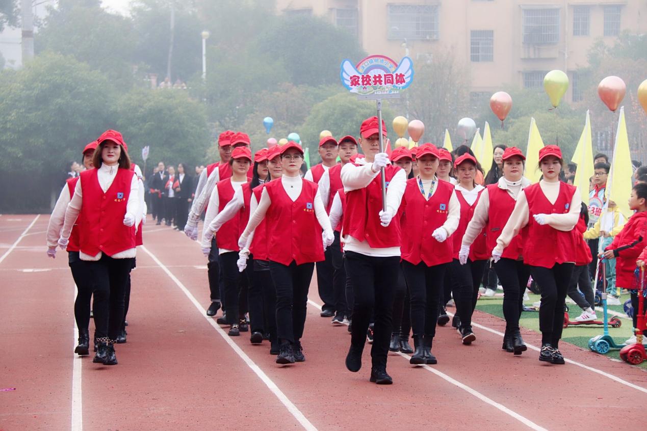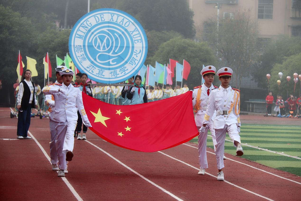 从小不坠凌云志,明德健儿当自强。少年强则国强,8点28分,入场仪式表演开始了。飒爽英姿、步伐整齐国旗队、校旗队、彩旗队、鲜花队、平衡车队、各班级队员方阵队、教师代表队、家长志愿者代表队共55个精神抖擞的方阵队分别入场。本次开幕式各方阵队以古典诗词的诵、演为创意编排的节目展现在全体师生面前,无不体现了明德人的诗教特色与文化创意,为观众们奉献了道道五彩缤纷的视觉创意大餐,运动场上一道道亮丽的风采,博得了师生们阵阵掌声。随后,校长张洪洲作了"文化体艺齐头进,教育振兴大路宽"的大会致辞。