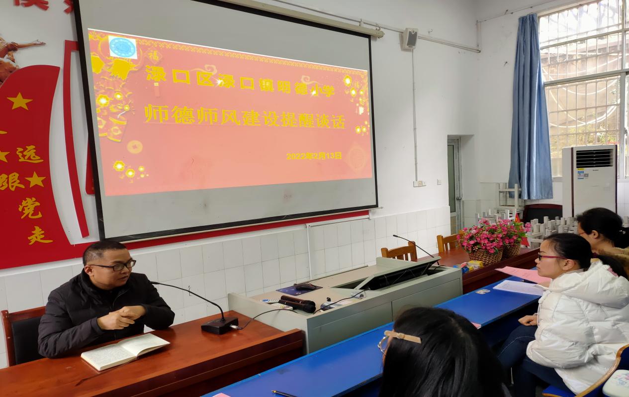 虎气频催翻旧景,春风浩荡著新篇。新的学期又开始了,为切实提升全体教师思想政治素质和职业道德水平,加强师德、师风、师资队伍的建设,2月13日,渌口区明德小学组织开展了以"赓续百年初心,担当育人使命"为主题的师德师风专题教育活动。活动在学校多媒体教室举行,学校全体教职工参加了此次教育活动。