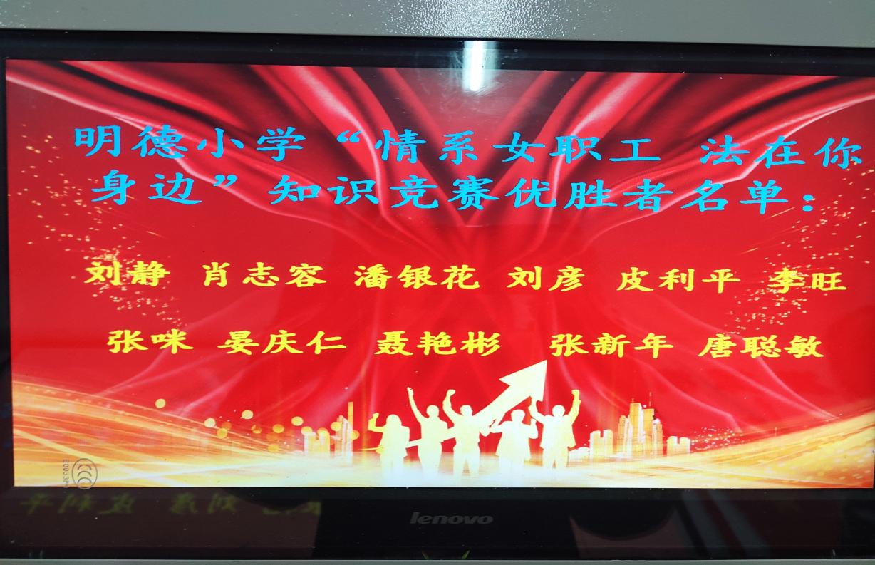 镜头三:为贯彻落实《中国妇女发展纲要(2021-2030年)》精神,节前,学校组织全体女教师认真学习了《民法典》、《家庭教育促进法》、《反家庭暴力法》、《妇女权益保障法》、《未成年人保护法》、《禁毒法》等法律法规,还组织学习了防电信诈骗、民族宗教政策、垃圾分类等相关知识。同时号召她们积极参加由全总女职工部和全总法律工作部主办,"学习强会"平台承办的"情系女职工 法在你身边"线上知识竞赛,在此次比赛中,有刘静、肖志蓉、刘彦、潘银花、皮利平丶李旺、张咪、晏庆仁、聂艳彬、张新年、林凤泉、唐聪敏等老师以满分的成绩获得优胜奖。