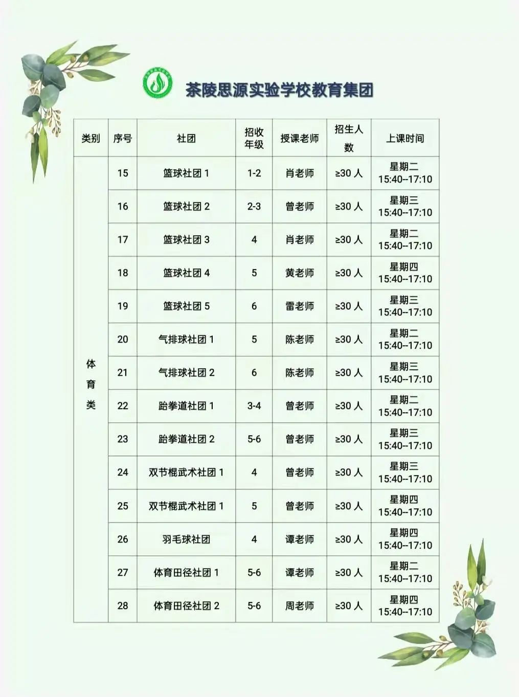 艺体类有阳光体育(足球、篮球、跳绳、耐力/体能训练等)、七彩绘画、简笔画、折纸剪纸、棋艺天地、动感声律等。健体魄;亮青春;展风采