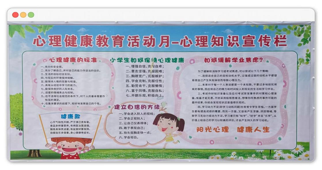 五月,立夏之季。风吹停了雨,灿烂的阳光与美丽的大自然相遇,而我们与健康拥抱。为全面加强心理健康知识宣传,不断提升中小学心理健康素养,让更多学生关注自己的心理健康,了解心理健康知识。虎踞中心小学开展了"关注心理健康,积极快乐生活"主题系列活动。