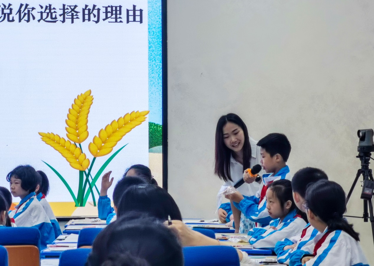 活动中,教师李羽艳执教小学四年级道德与法治《我们的衣食之源》。比赛现场,她结合生活中的实例导入,激发学生在家里种蔬菜的兴趣。通过孩子们的积极探讨,设计家庭无土栽培种植蔬菜的容器,解决特殊时期"买菜难"问题;在此基础上,进一步探讨大米的由来,全球粮食安全与危机,引导学生珍惜粮食,从而激发学生热爱劳动,懂得科技兴农。