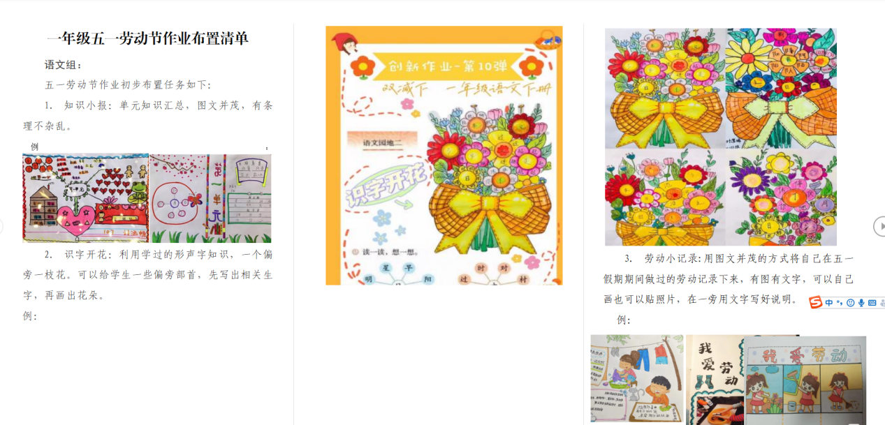 语文组积极进行特色作业的尝试,充分调动学生的学习能动性,寓教于乐。针对低年级段学生,设计了"识字开花"和制作思维导图、每天"悦读"一小时作业,让学生在动手过程中巩固知识;