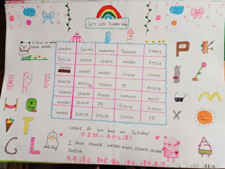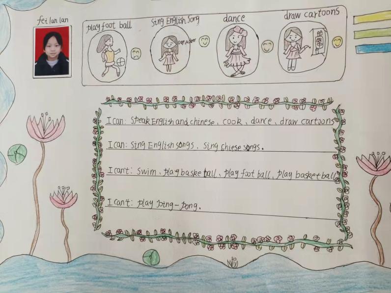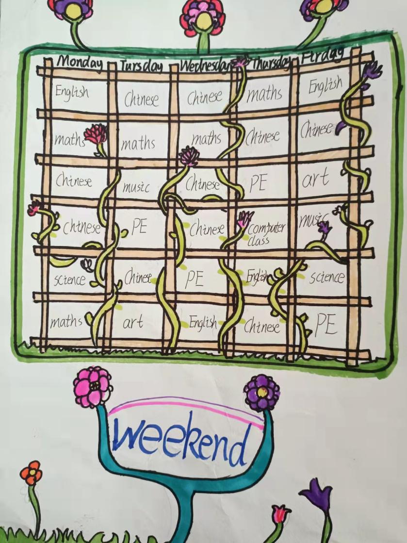 为高年级段学生设计了我的自画像、绘本跟读配音、自制课程表、课本模仿秀、举办英语趣配音比赛等。 此类作业指向语言学习的更高层次,需要学生进行迁移和创新,以达到激发学生学习的兴趣,提升学生的学习效果。