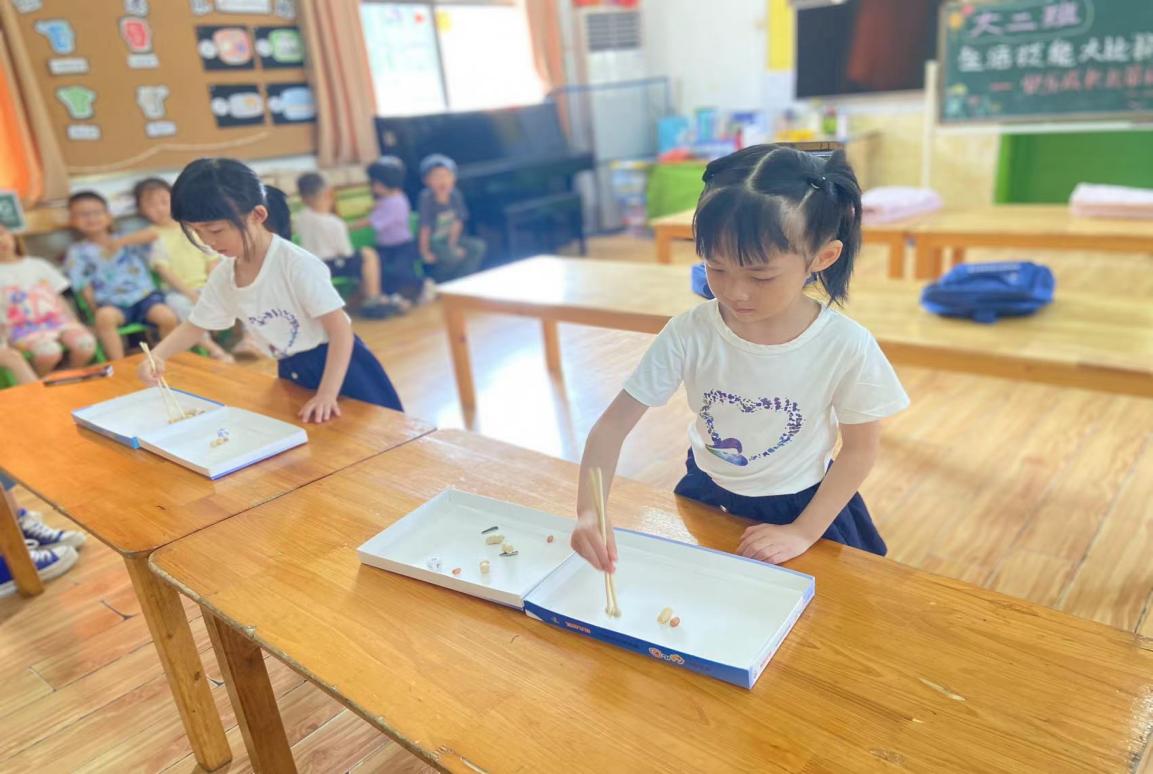 结合大班小朋友的年龄特点和身心发展规律,比赛项目分别设有:叠被子、整理书包以及筷子夹"豆"(花生、花生米、葵花籽和骰子)。活动过程进行得紧张有序而富有童趣。各位小选手有序地站好位置,专注地做好充分准备!在主持老师的口令声中,他们既迅速又整洁地完成比赛。