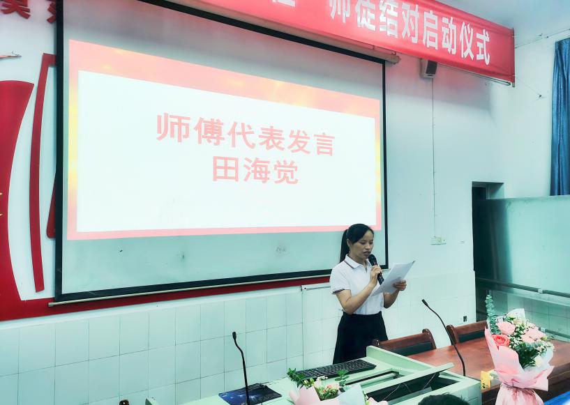 凝心聚力、薪火相传的氛围洋溢在会场。师傅代表田海觉老师道出了所有师傅的心声,他们愿意为新教师的快速成长尽心尽力,同时,也会不断向青年教师学习新的教育教学理念,师徒双方教学相长,共同进步。徒弟代表丁敏老师,表达了对学校领导和师傅的感激,让大家看到了她对尽快成长的渴望和对做好本职工作的决心。师徒的精彩发言获得了在场老师的热烈掌声。