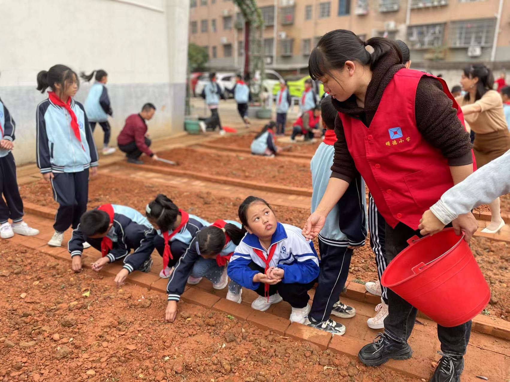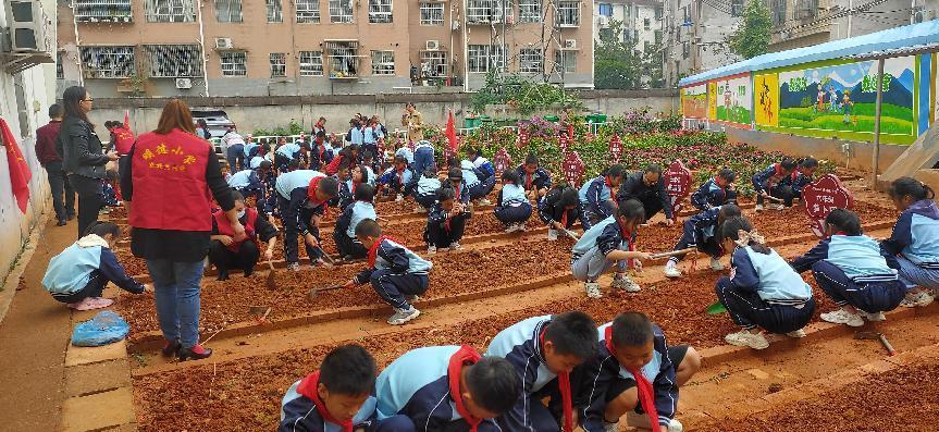 同学们在老师和家长的带领下,从认识种子菜苗到松土施肥,再到栽种浇水。大家埋头干活儿,手上、鞋上沾了泥也顾不上擦,忙得不亦乐乎。