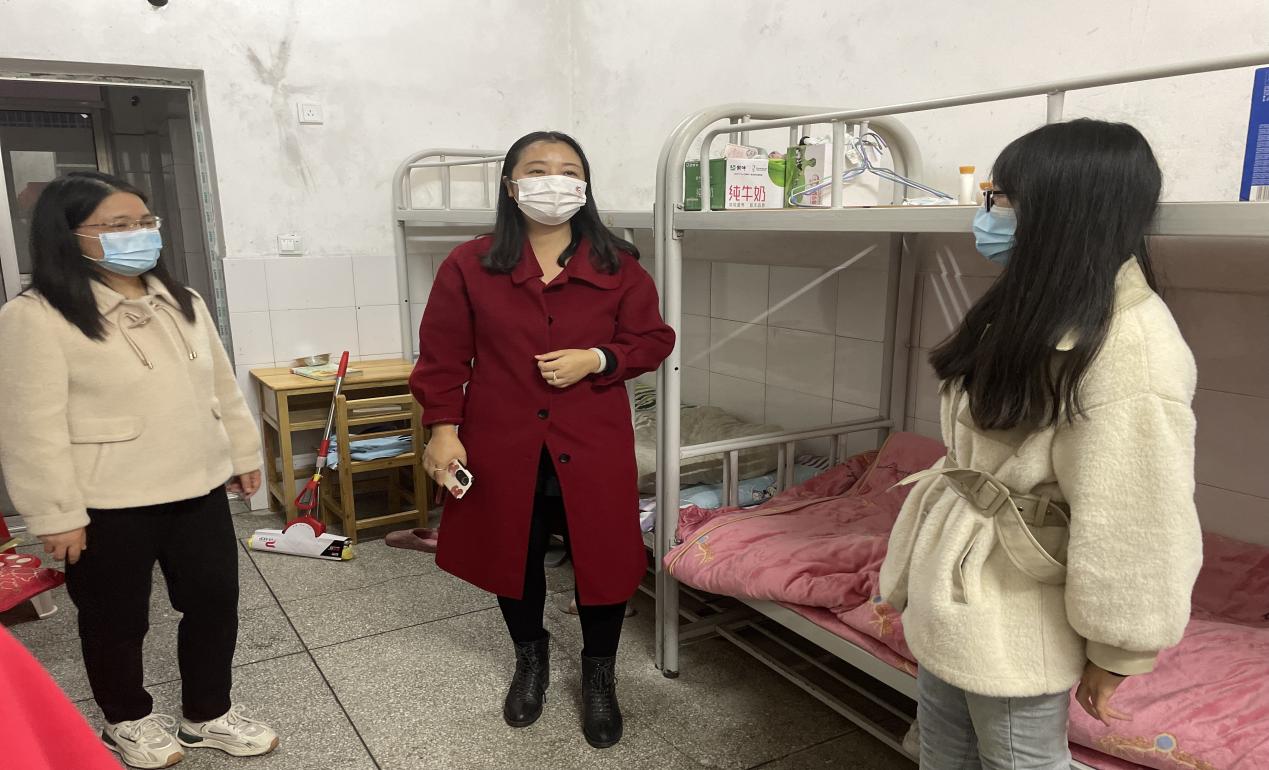 在公寓楼,吴平校长详细询问了住校教师生活,她说,你们住在学校还习惯吗?这么多天没回家,有什么困难?龙老师回答她说:"我们在学校一日三餐吃得饱、吃得好,食堂从菜品、菜色、营养等方面细节入手,尽量满足我们的餐饮需求,伙食做到不重样,让我们尝到了"家"的味道,心中倍感温暖。"
