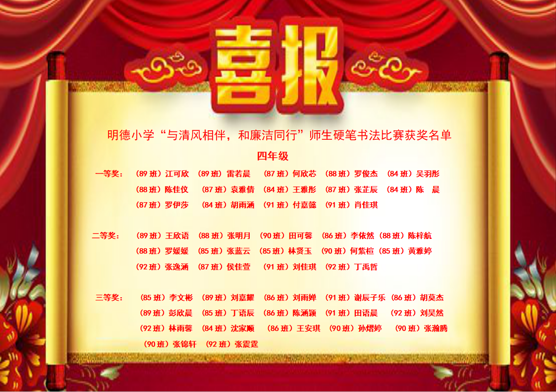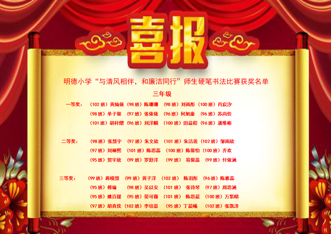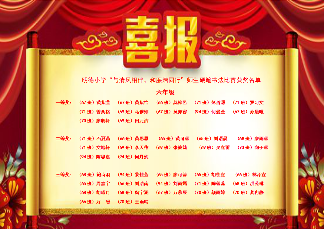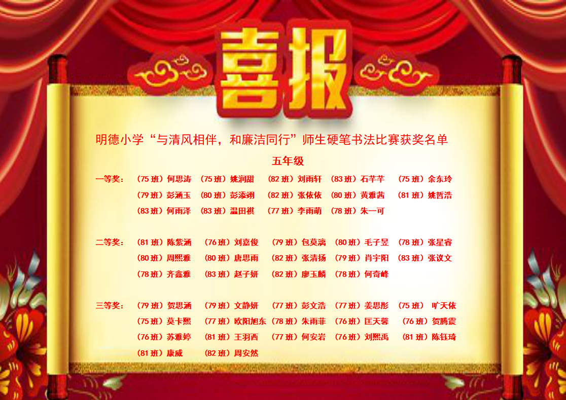 为深入推进学校清廉文化建设,营造"敬廉崇洁,廉洁从教"的良好氛围,提高全体师生的反腐倡廉意识和汉字书写水平,株洲市渌口区明德小学组织全校师生开展"与清风相伴,和廉洁同行"为主题的硬笔书法比赛。