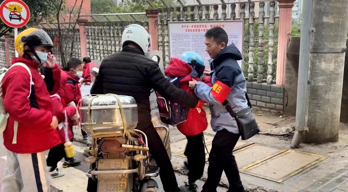 首先,在上学、放学高峰期,交警、老师、家长志愿者组成的"安全护学岗"在学校周边路段,开展摩电违法行为及交通安全宣传劝导活动。向超员超载、不戴或不规范佩戴安全头盔、逆行等各类不文明交通违法行为进行耐心劝导和纠正,并告知其安全隐患及危害性;提醒过往车辆礼让行人,路过学校路段时减速慢行;引导学生走斑马线,安全过马路。