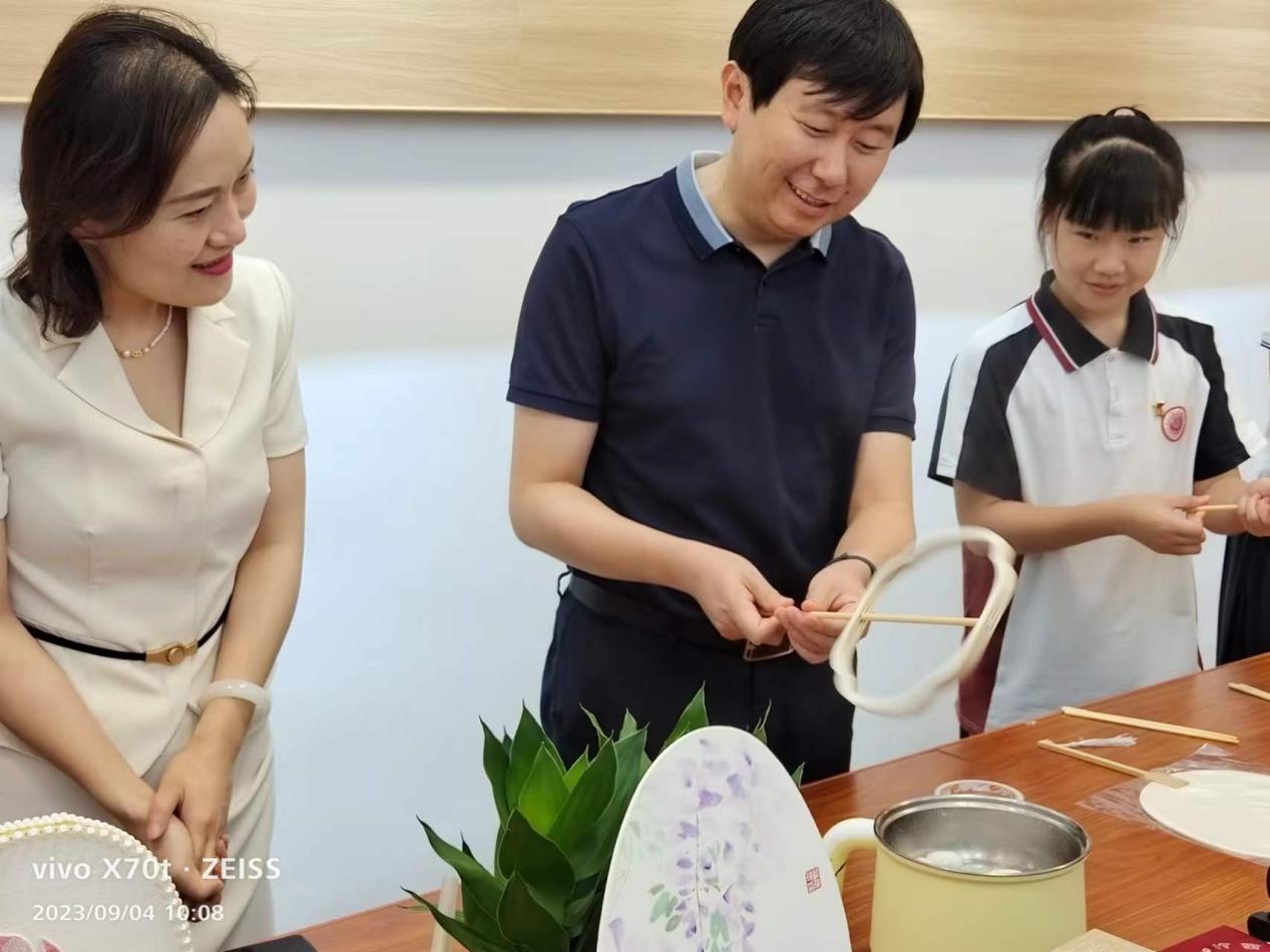 随后,他来到明德小学本部校区,对干净、美观的校园环境;创新的集团化办学模式给予了充分的肯定和表扬。他还视察了明德小学劳动教育特色基地,当他来到"四坊"劳动教育基地的"制扇坊"时,还饶有兴趣和学生们一起制扇。他体验后指出,我们要教育学生感受非遗文化无限的魅力,增强学生的创造力和动手能力,才能有效促进非物质文化遗产在校园的传播,进一步提高师生的非遗保护意识。