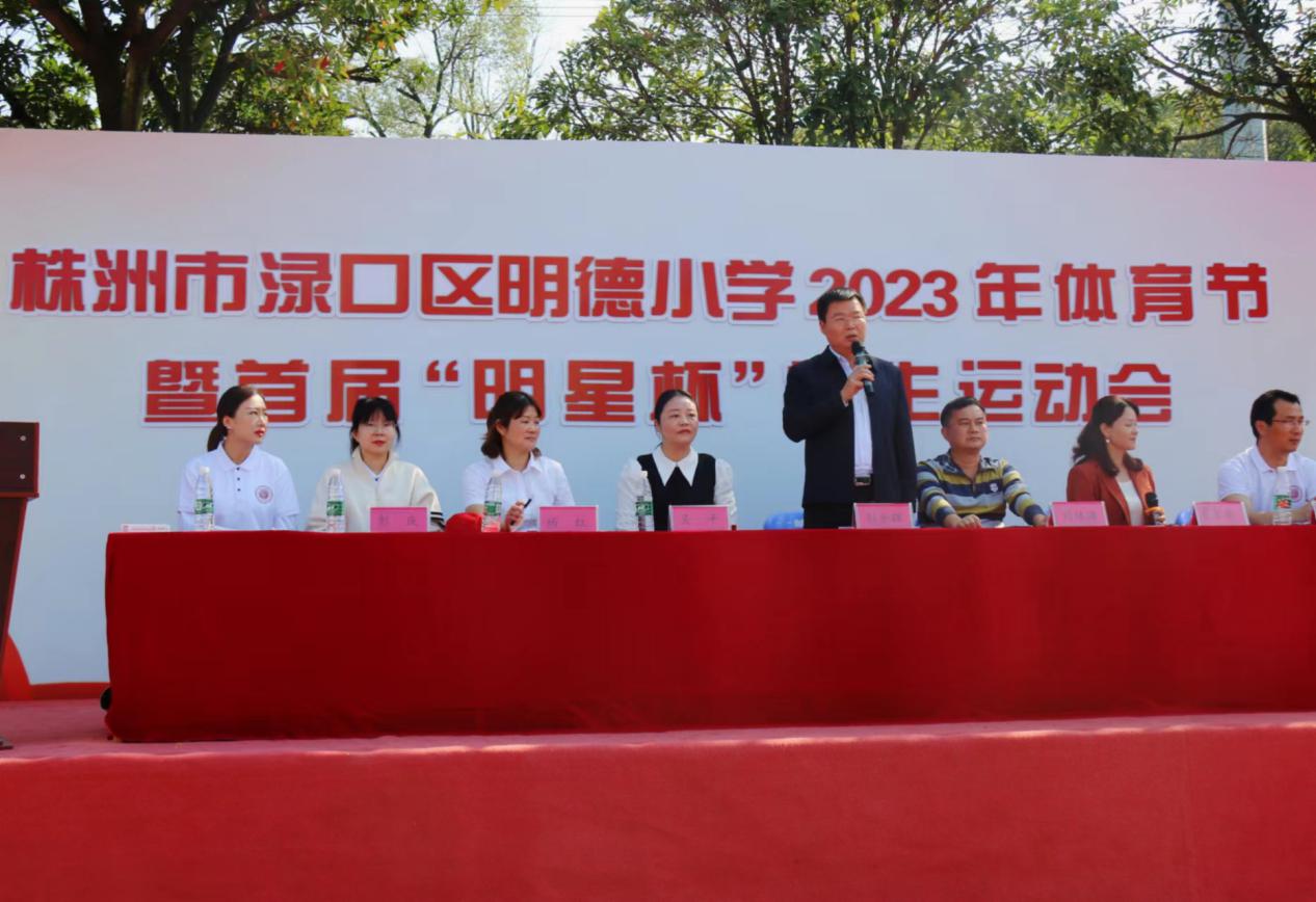锤炼强健体魄,助推教育振兴。为贯彻落实"以体强校,以体育人"的办学理念,提高学生的综合素养。11月1日,渌口区明德小学隆重举行了2023年体育节暨首届"明星杯"学生运动会开幕式,渌口区教育局党委委员、副局长彭中辉、基础教育股股长刘林满、校级领导出席开幕式,仪式由学校校长夏宗华主持,副局长彭中辉宣布开幕式开幕。