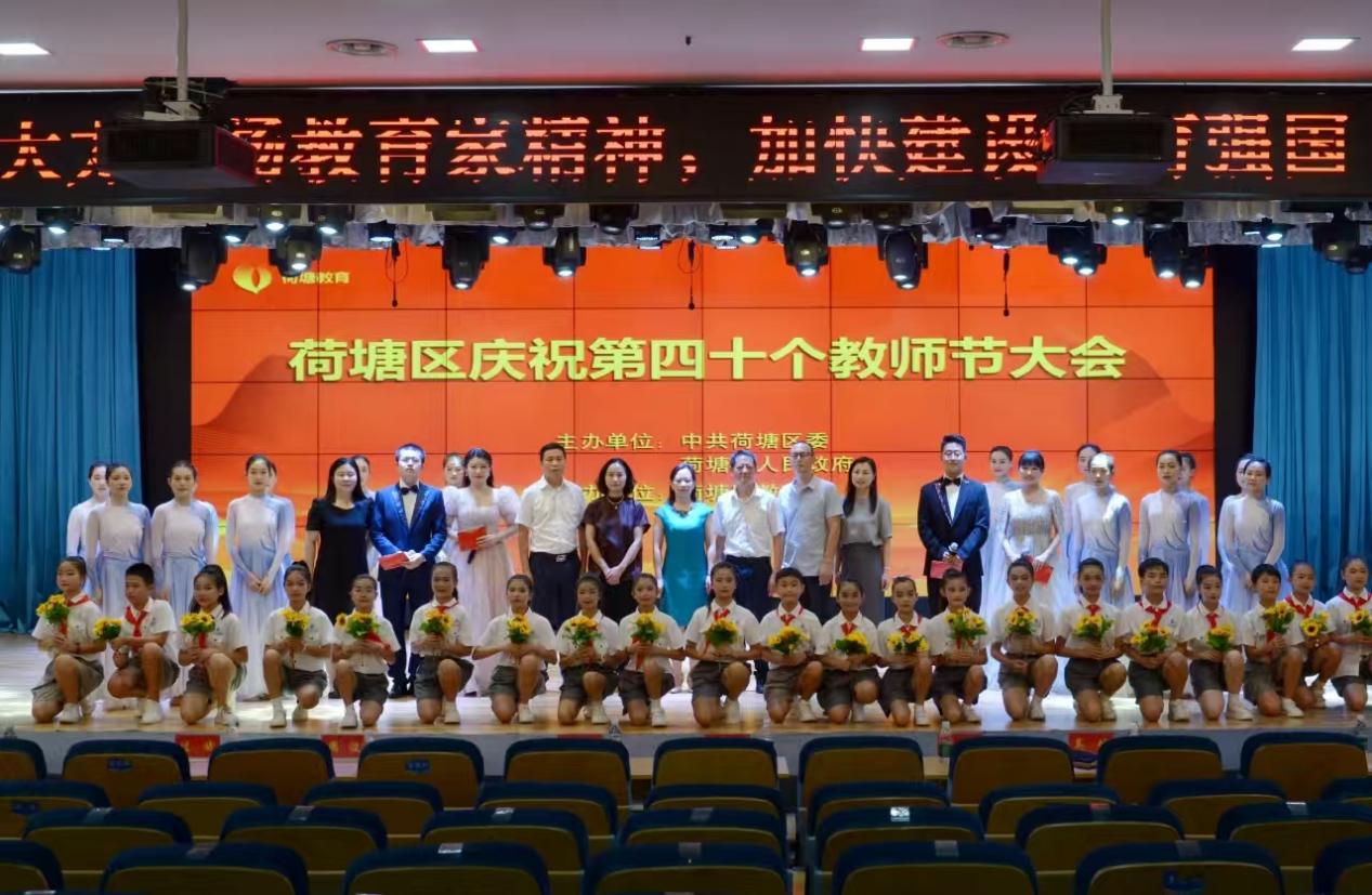 9月9日,荷塘区庆祝第四十个教师节活动在美的学校举行。荷塘区人民政府副区长罗曼出席活动。区教育局全体班子成员,全区中小学校长、书记(专职副书记),学校中层代表,责任督学,优秀教师代表,新进教师等400余名教师参加活动。