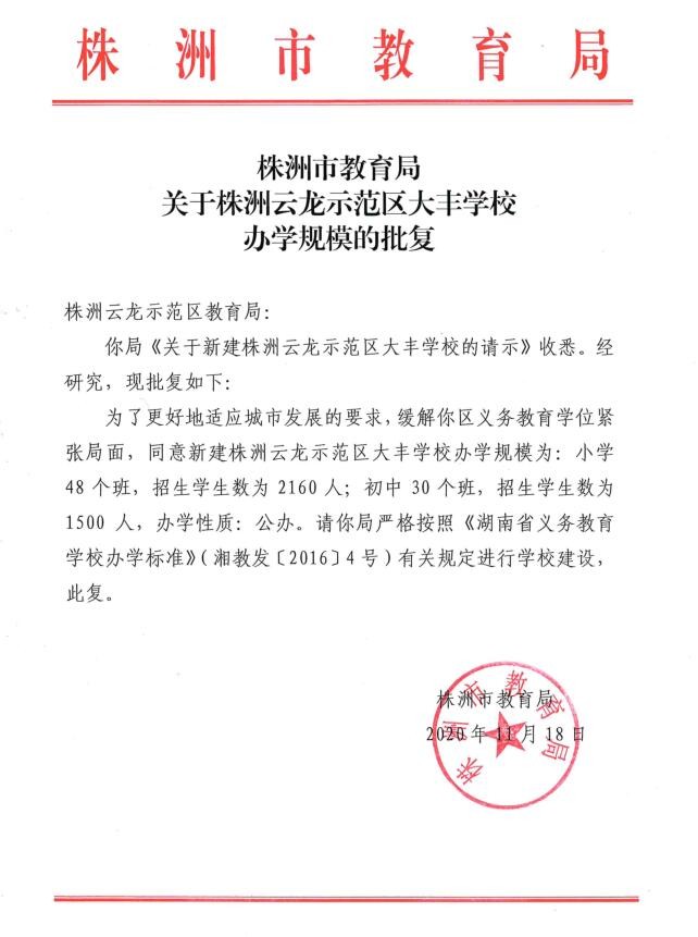 株洲市教育局关于株洲云龙示范区大丰学校办学规模的批复