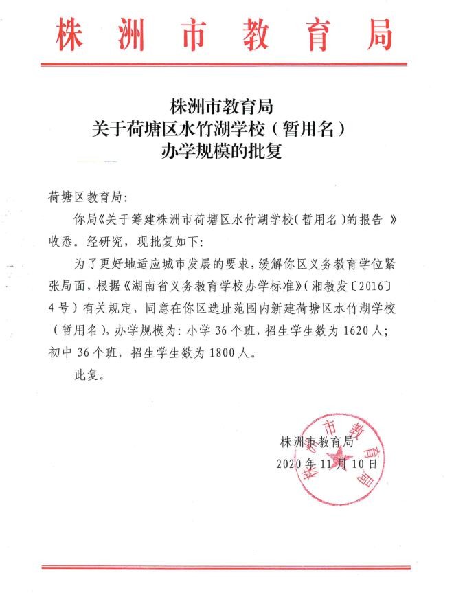 株洲市教育局关于荷塘区水竹湖学校(暂用名)办学规模的批复