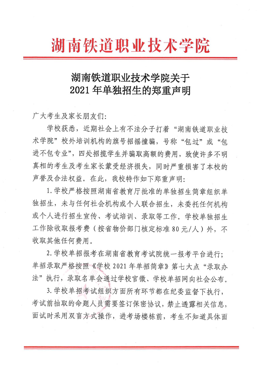 湖南铁道职业技术学院关于2021年单独招生的郑重声明