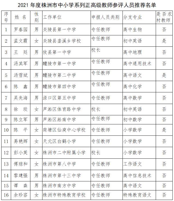 2021年度株洲市中小学系列正高级教师参评人员推荐评选工作已经结束,现公示推荐参评人员名单,公示期为:2021年10月25日至10月29日。联系电话: 28681072,22663736,22660118。