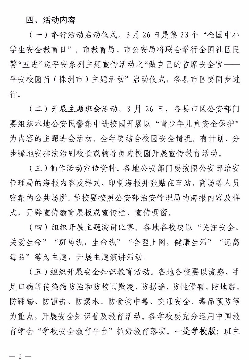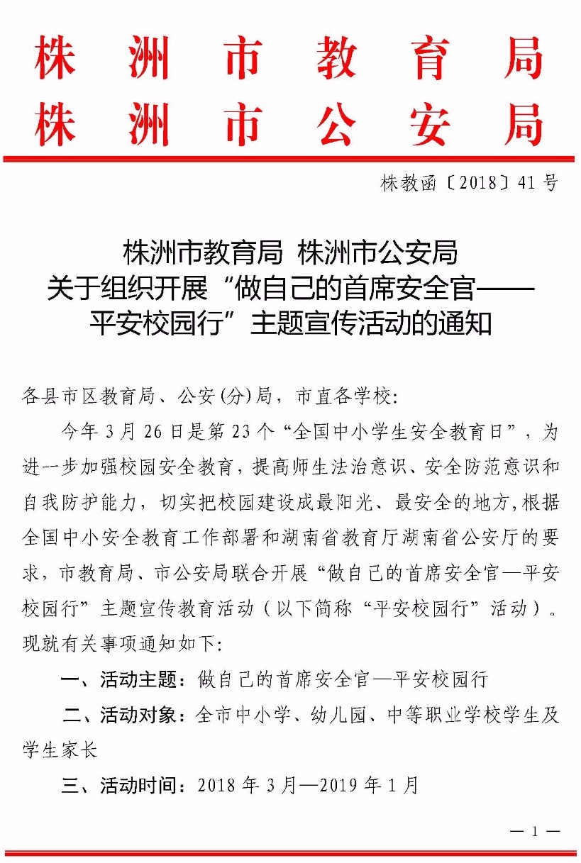 株洲市教育局 株洲市公安局关于组织开展“做自己的首席安全官”--平安校园行“主题宣传活动的通知